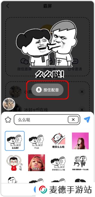 3、选择表情,点击“按住配音"可以发送语音消息切换到相机还可以拍照和发视频。