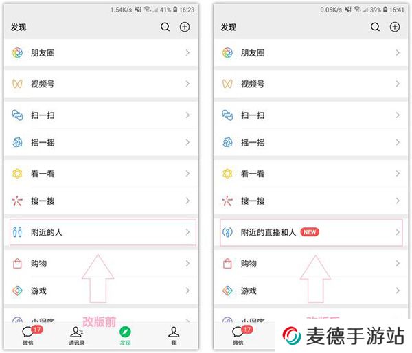 二、发现页改版打开微信点击底部的【发现】,将会看到【附近的人】变成【附近的直播和人】,新增了视频和直播功能,里面的视频和直播,都来自于视频号哦。