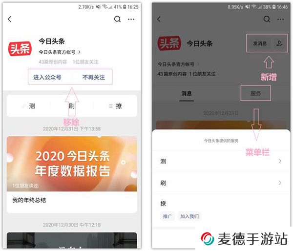 三、公众号改版本次更新,公众号界面也有所改变,移除了“进入公众号”和“不再关注”按钮;右侧添加了“发消息”和“取消关注”按钮;菜单栏被添加到【服务】栏目。