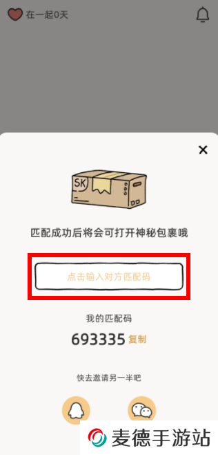3、同样,也可以将自己的匹配码复制发送给对方,让对方进行匹配,还能通过qq和微信区邀请另一半。