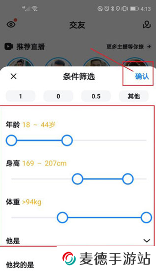 3、在条件筛选界面可根据特定条件进行用户搜索,选定条件后,点击右上角的“确定”,即可进行搜索;