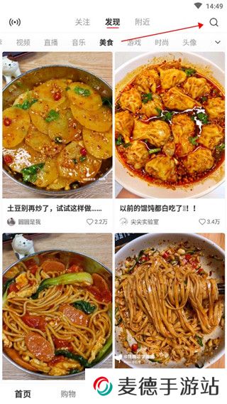 2、进入到软件后,可以选择上面的美食,进入到美食页面,就可以看到很多的美食分享,也可以选择右上角来搜索你想了解的美食。