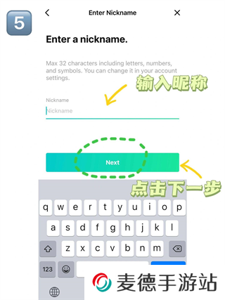 5、输入昵称,未重复的昵称可继续下一步 Next