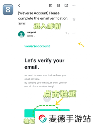 8、打开自己的邮箱会收到来自APP的验证邮件,点击Verify Email即可验证成功,这时候weverse账号注册就完成了,返回app就可以登陆啦