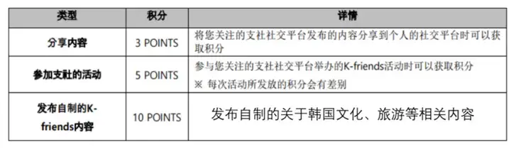 K-friends是韩国旅游发展局运营的官方线上应援团,k-friends意为“喜爱韩国的朋友们”,通过在线分享和传播韩国的文化、美食、时尚、潮流、k-pop等种类多样的内容,获得积分领取相应的奖励,担当着向全世界介绍韩国的宣传大使的重要角色。