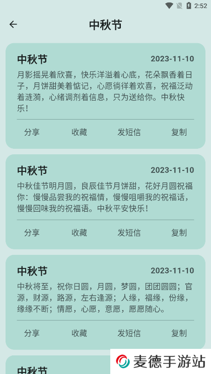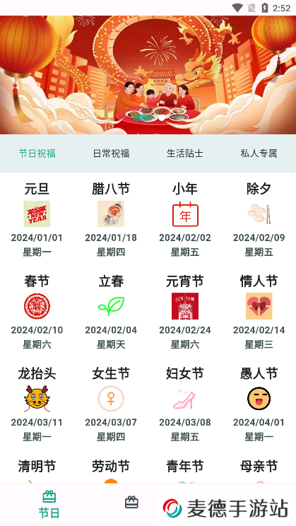 软件亮点精选节日祝福,精美的节日图标,节日分为农历节日和公历节日,可以通过短信微信等第三方应用发送节日祝福给家人和朋友,还可以通过分享功能分享到其他途径传播祝福信息。