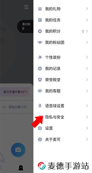 3、在打开的侧边栏中点击隐私与安全设置